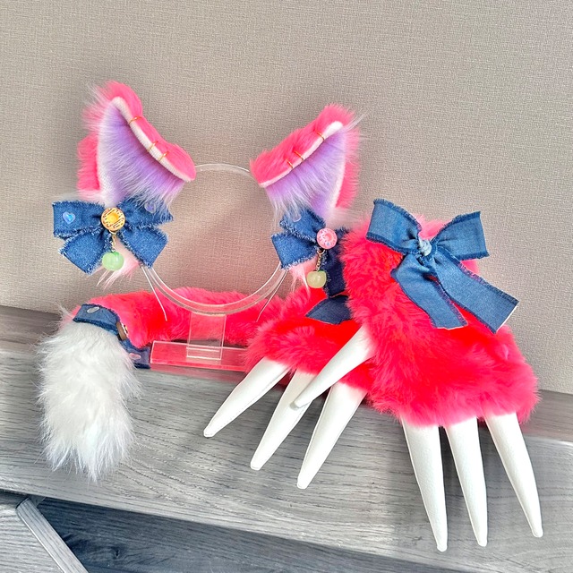 ショッキングピンクのケモ耳にデニムリボンを合わせました! 長い爪のついたグローブがケモノ感をさらに増して、かわいいです! 耳の高さは約8〜9cm。尻尾の長さは、約45cm。 リボンは取り外し可能。ピアスは取り外し不可。 グローブのサイズは女性用です。 ※こちらは人間用サイズです。 ※1点1点手作りとなるため、商品によって多少の個体差があります。お使いの端末や閲覧環境により、写真と実物の色味や質感が多少異なって見えることがございます。既製品のような完璧を求める方はご遠慮お願いします。また熱に弱いボンドを使用しておりますので、高温になる場所での保管、使用はご遠慮下さい。 ※新品の状態は毛が抜けやすい場合がございます。 ご了承下さい。 ※繊細で壊れやすい商品です。お取り扱いにはご注意ください。 ⚠︎メルカリ、またはその他フリマ、オークションでの再出品はご遠慮下さい。中古品としてお友達間など裏でコッソリ譲渡のお取引していただく分にはOKです。