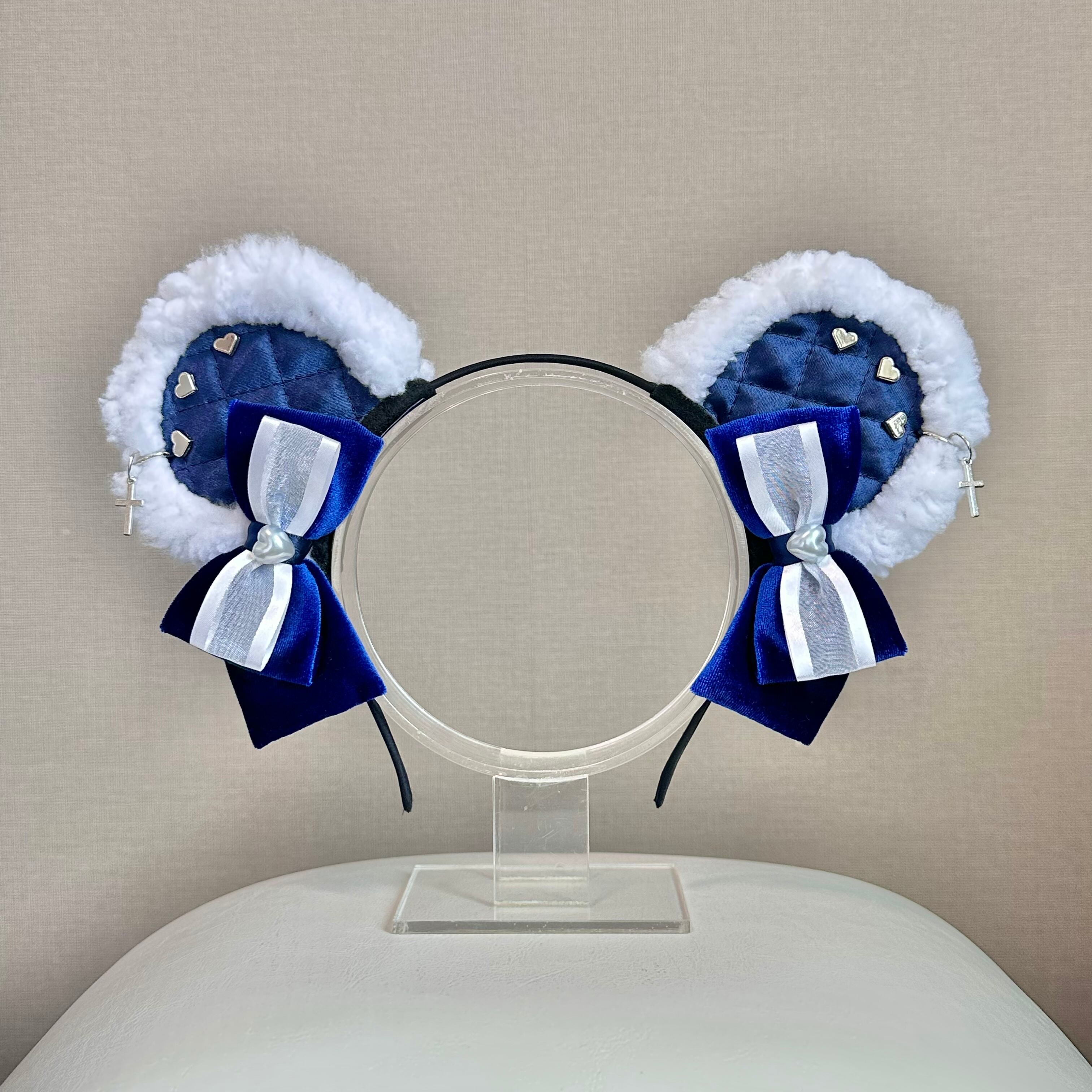 ブルー(紺)のキルティング生地にふわふわファーを合わせて、ぬいぐるみのような仕上がりに。